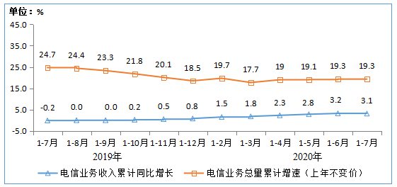 工信部指出,电信业务收入增速平稳。1-7月,电信业务收入累计完成8027亿元,同比增长3.1%,增速较上半年回落0.1个百分点。按照上年不变价计算的电信业务总量为8416亿元,同比增长19.3%,增速与上半年持平。