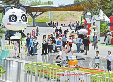 5月4日,在2024成都世园会主会场蓉城时光街旁的无人送餐点,无人机按照设定的航线将游客的外卖送达。